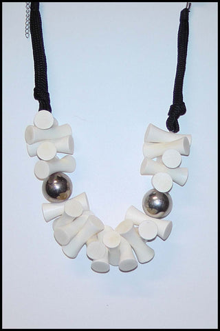 Wood bead tribal inspired necklace featuring a short necklace with bone shaped beads separated by 2 large silver coloured metal spheres Available in black, beige, white Material: wood, mixed metals,...